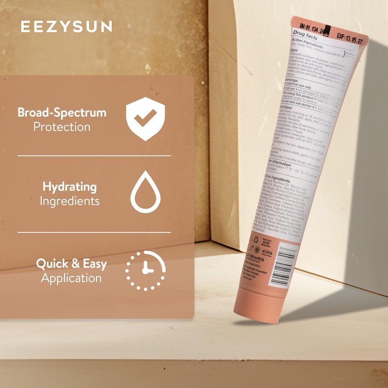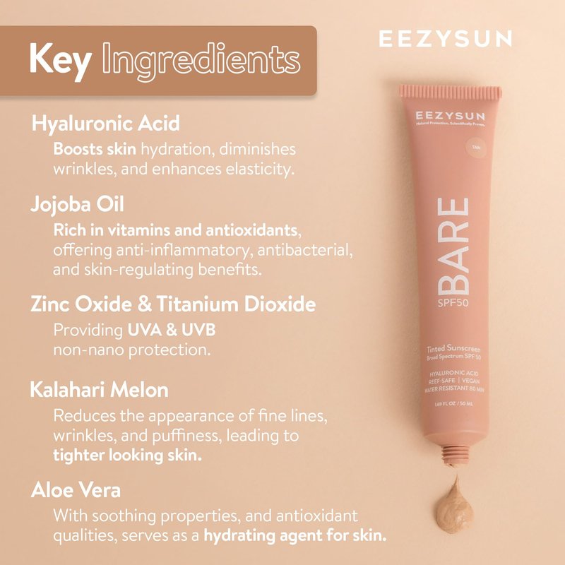 - Lightweight Hydration: With Hyaluronic Acid to attract moisture, Aloe Vera to soothe, and Kalahari Melon to refresh, EEZYSUN BARE Tinted Sunscreen SPF 50 leaves your skin feeling moisturized and smooth