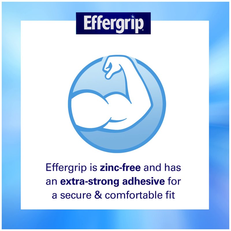 - Effergrip Denture Adhesive has an extra strong adhesive for a powerful grip; You'll feel confident your dentures won't slip even when eating something that requires a lot of pressure
