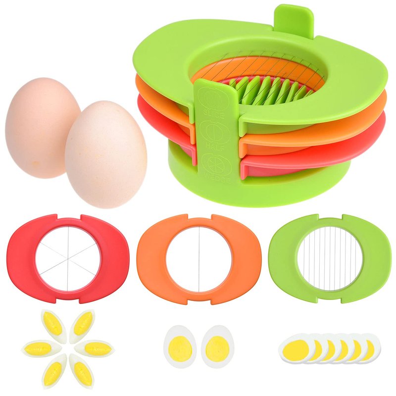 - MORE POSSIBILITIES >> With a regular egg slicer you can only cut boiled eggs into slices. This set of 3 egg slicers allows you to cut boiled eggs into thin slices, wedges and halves. The slicers can also be used to cut certain fruits, vegetables, dairy products or even soft cakes.