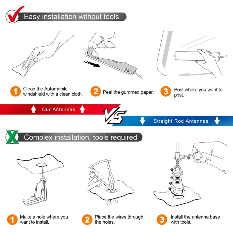 - Mounting Method: remove adhesive tap, stick the antenna on windshield /window