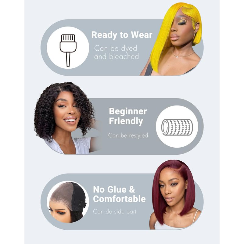 - Glueless wigs for easy and convenient wear: Our 9x6 HD Lace bob wig human hair is designed with a glueless construction, allowing you to effortlessly install and remove the wig without the need for any adhesive or special skills. Simply ready go in just 30 seconds! Perfect for beginners and busy individuals