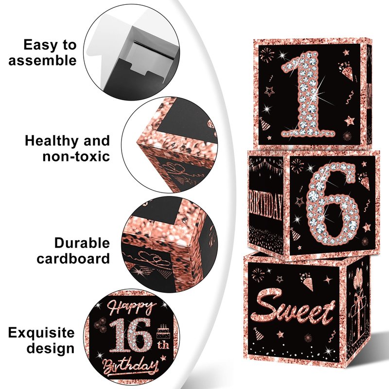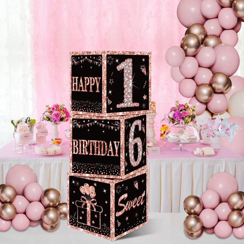 Eiurteao 3pcs 16th Birthday Decorations Boxes for Girls, Rose Gold Happy 16 Birthday Balloons Boxes Party Supplies, Sweet Sixteen Bday Theme Cardboard Box Decor