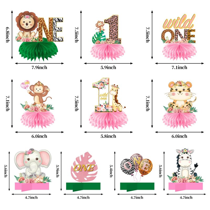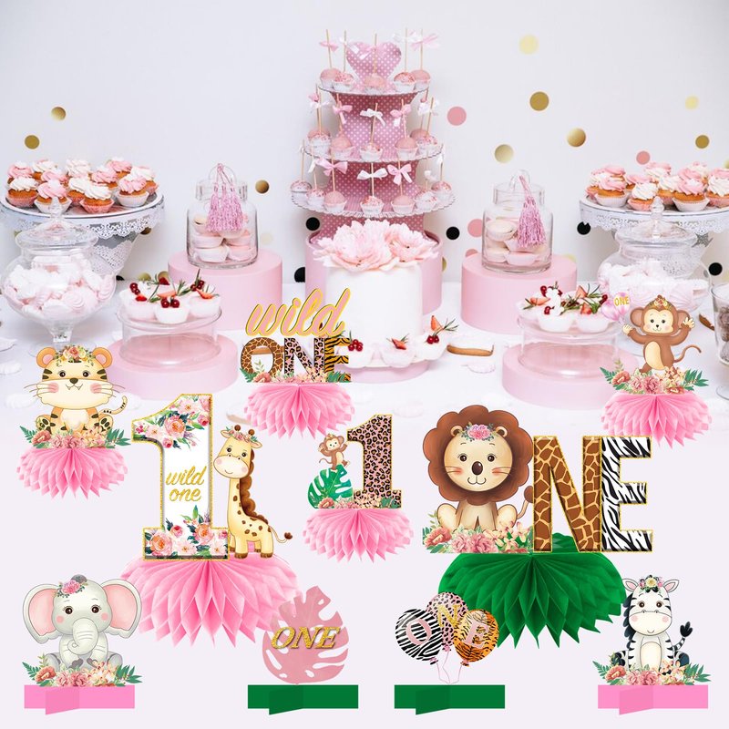 - [Safari Jungle 1st Birthday] - This pink safari jungle animal theme first birthday honeycomb centerpieces decorations integrates various cute animal elements and palm leaves into the 1st birthday party event. These fun pattern designs will make your jungle one year old birthday party more warm and happy.