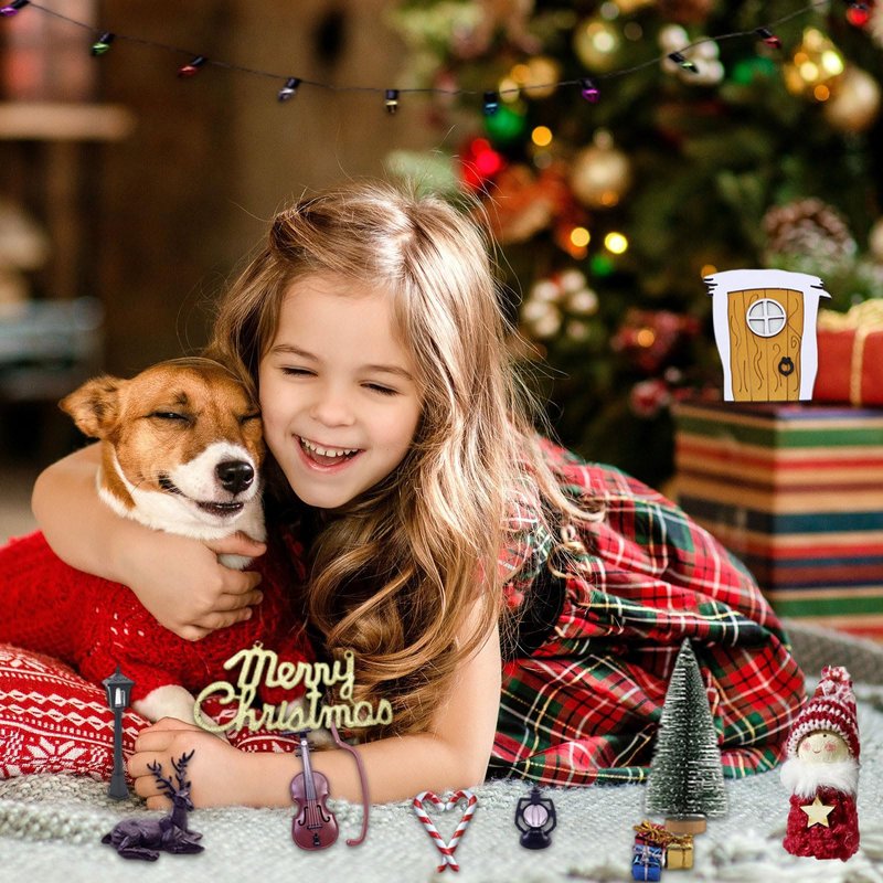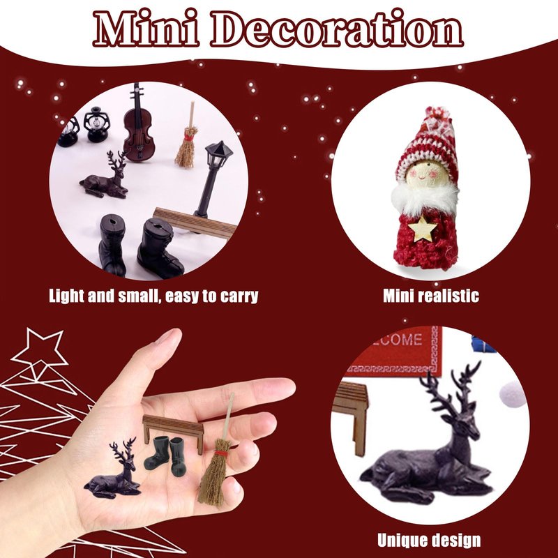 - 33 Doll House Christmas Decoration: Our christmas dollhouse decorations include wooden doors, broom, 6 snow globes, a Merry Christmas text, 4 gift boxes, 2 windows (one large and one small), lighthouse, a pair of boots, 3 candy canes, 2 oil lamps, a fawn, a ladder, a carpet, a doll, a Christmas tree, a string of decorative lights, a violin, a cup, and self-adhesive stickers etc.