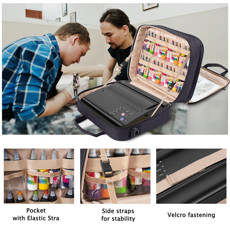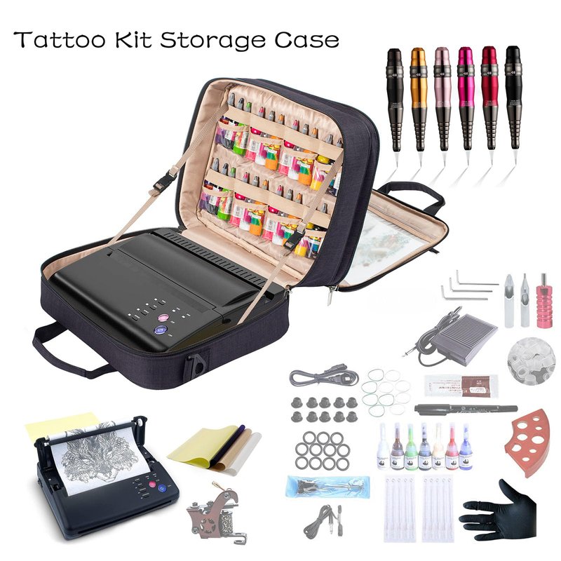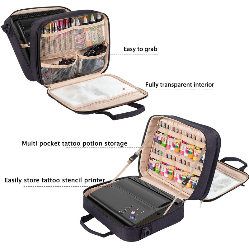 - 【DOUBLE SIDE FULL OPEN DESIGN】Tattoo kit organizer case with its innovative double-sided full open design, the main compartment of the case can effortlessly lay flat, providing convenient access to its contents. Additionally, the inclusion of an elastic band serves to securely hold the tattoo stencil printer in place, ensuring both organization and protection within the tattoo case.