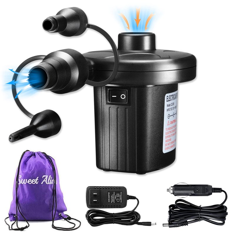 Electric Air Pump, 110V AC/12V DC Portable Air Mattress Two-Way Universal Inflator Pump for Inflatables Pool, Airbeds, etc with 3 Nozzles and 1 Storage Bag