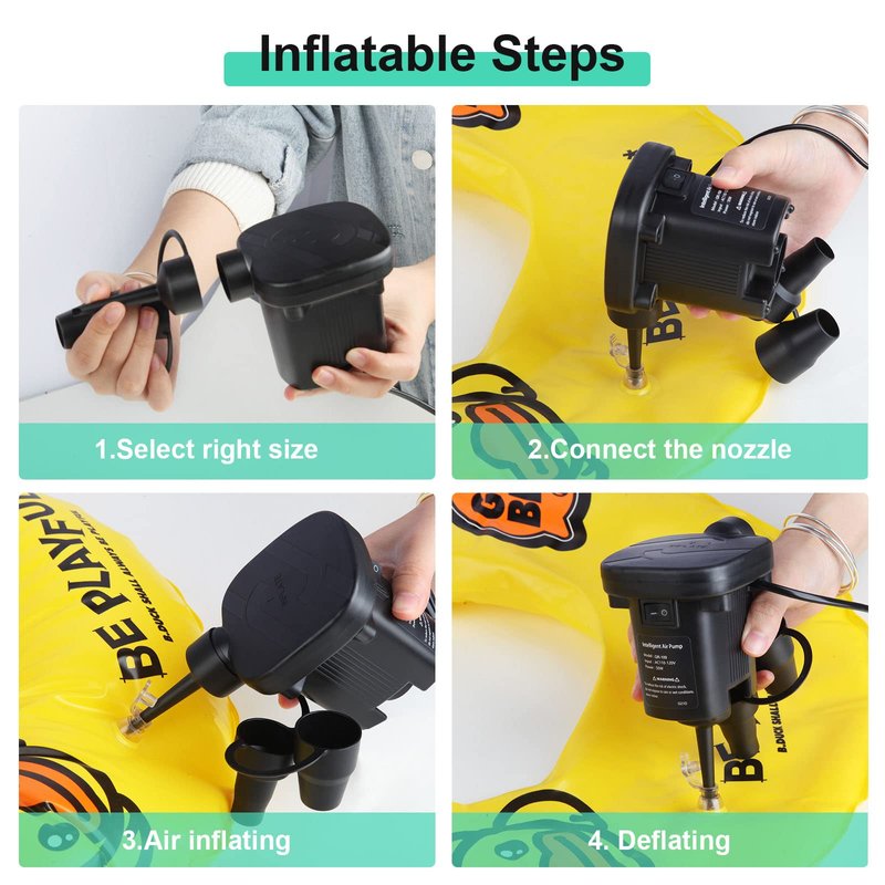 - 3 Types of Nozzles: The air mattress pump has 3 different size of nozzles-S (0.27''), M (0.67''), L (0.87''), the electric air pump's nozzles stay lock-secured without losing air, allow you quickly to inflate/deflate air mattress, sofa, inflatable rafts, air beds, boat, pool toys, swimming rings, inflatable doll, vacuum storage bag, snow tube etc. (Note: This inflator Pump not for balloons, basketballs, and tyres)