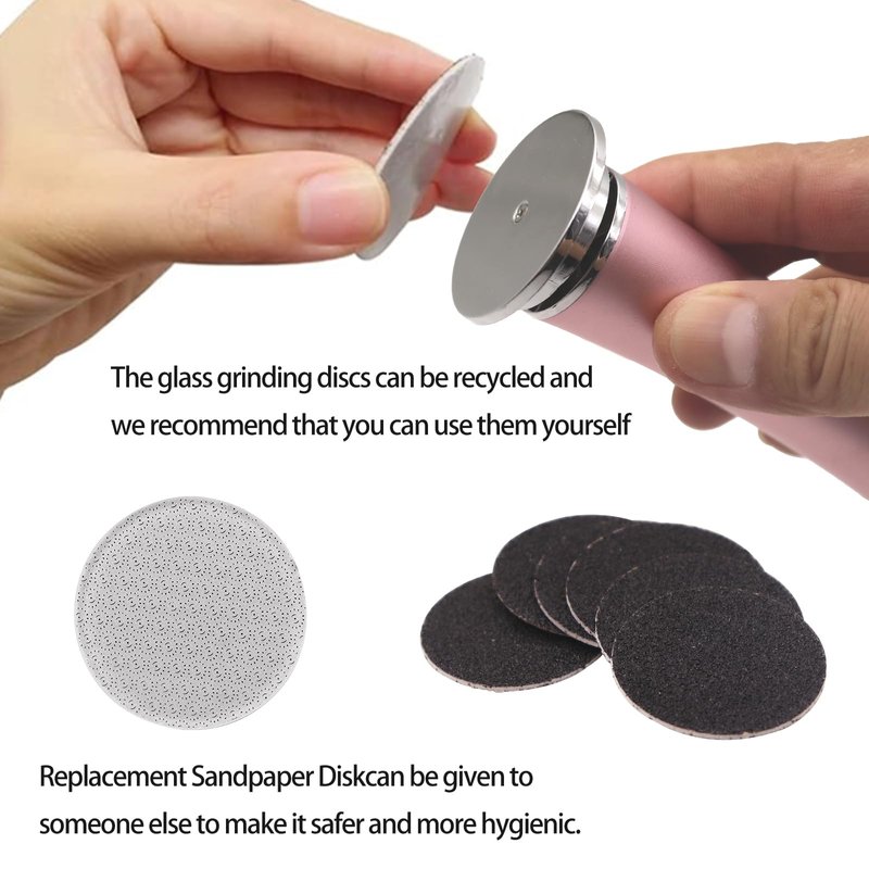 - 1pcs Recyclable glass grinding discs and 20pcs Replacement Sandpaper Disk are all included.The glass grinding discs can be recycled and we recommend that you can use them yourself, and the other sandpaper discs can be given to someone else to make it safer and more hygienic.The grade of sandpaper&glass grinder is suitable and get rid of dead dry skin and callus areas.