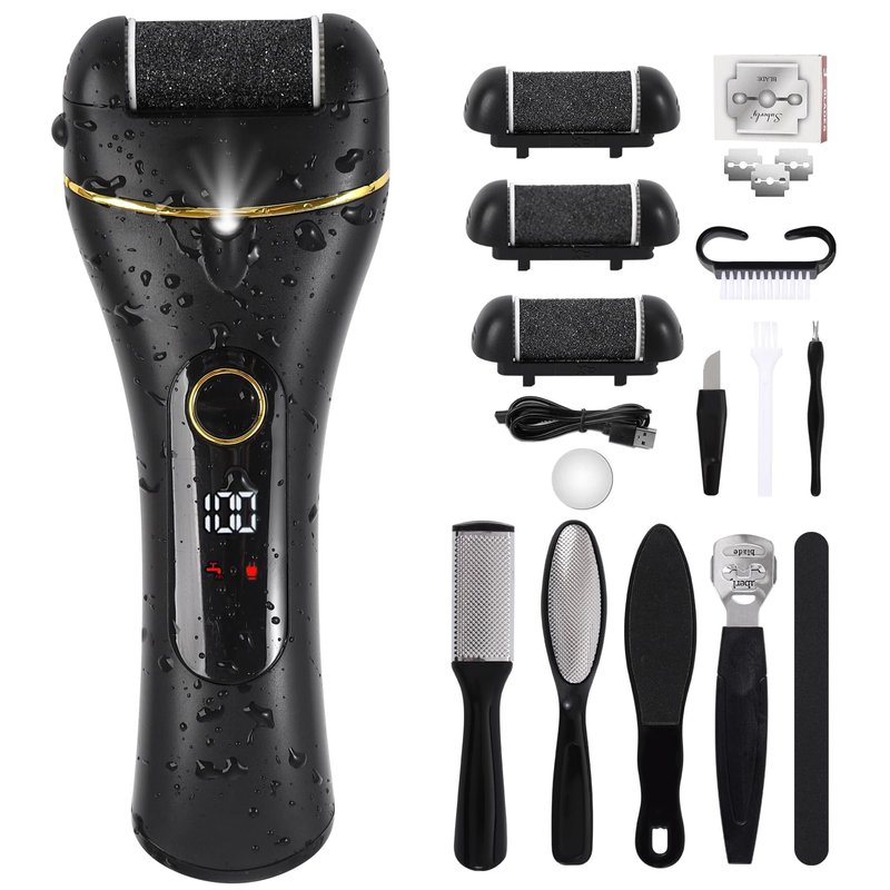 - What’s in the Foot Care Kits: Including Electric feet callus remover,3 different grinder heads, small cleaning brush, usb charging cable and 10 in 1 pedicure tools, which can bring the exclusive feet spa for your family members and friends