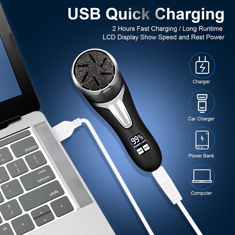 - Rechargeable Electric Foot Callus Remover, LCD Display ----- Foot file callus remover for feet only need 2hours usb charging and could get a 120min long runtime, including usb charging cable, this foot scrubber dead skin remover can easy charging with a laptop, power band, socket, and others; LCD Display show the speed and power status, let you how much battery left and remind you charge in time