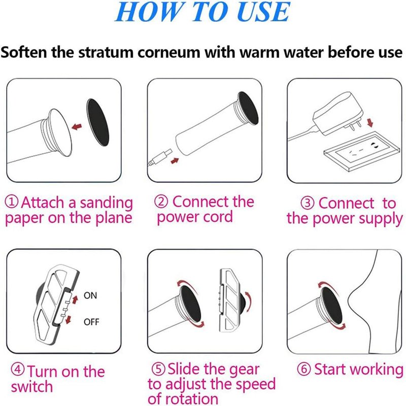 - 4. With Speed Adjustable: The speed of electric foot callus remover is adjustable, you can adjust the right speed to remove callus on your feet. (When using the machine, please don't apply too much pressure, otherwise it will cause the machine not to rotate and the machine will be damaged).