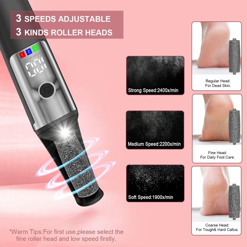 - 【3 Specialized Roller Heads】 The electric callus remover for feet takes care of your foot with three different roller heads: a fine sand head for everyday maintenance, a regular head for removing rough dead skin, and a coarse head for tackling stubborn calluses. These easy-to-swap smooth pedicure tools replacement heads are waterproof, ensure long-lasting performance and effortless cleaning, making them ideal for personalized foot care.