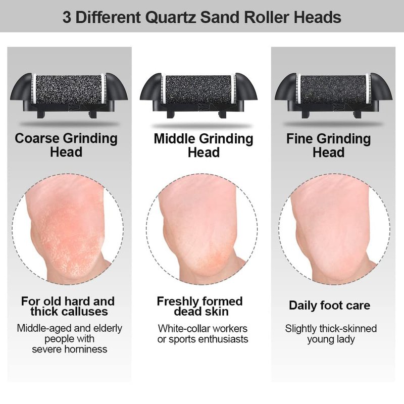 - 【Pedicure Kit with 3 replacement roller head】The electric foot grinder is equite with three removable roller heads, fine roller head is used for daily foot care; general roller head can treat new dead skin; the thick roller head is used to solve stubborn calluses and crack. This electric callus remover for feet is also equipped with a pedicure kit, which can meet a variety of pedicure needs.