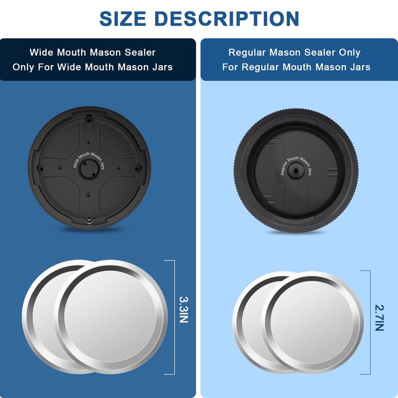 - 📍【Easy to use】The Food Vacuum Sealer with Standard Mouth Sealer Converter Kit is suitable for wide mouth and regular mouth Mason jars (Mason jars not included). Make sure the electric vacuum sealer is centred and pressed firmly against the lid of the jar, click the button to start the vacuum pump for 40s or more and the air can be evacuated to the seal. Clicking the button again closes the sealer.