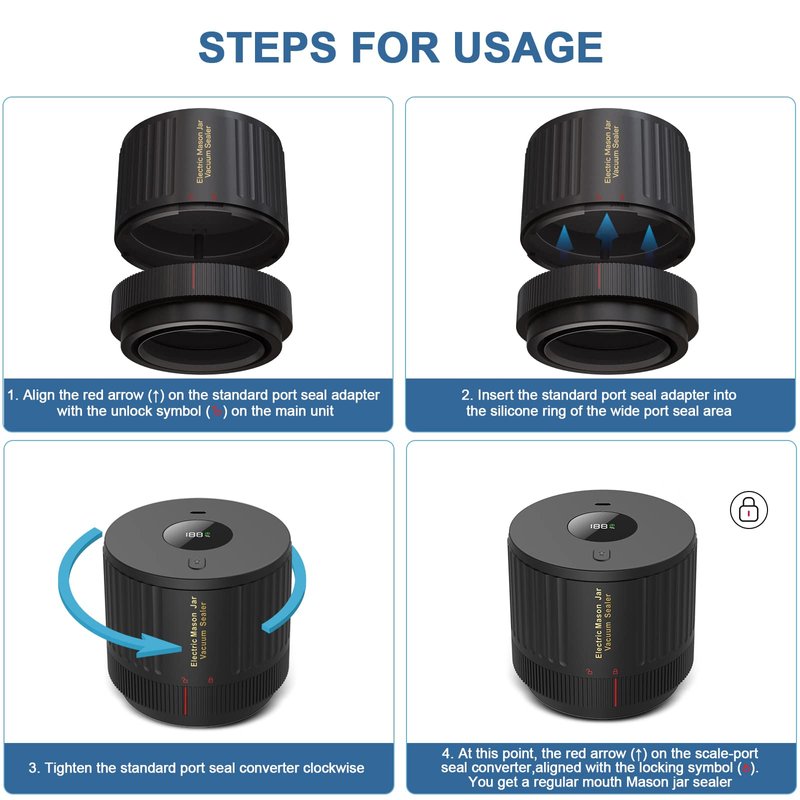 - 📍【Suitable for two types of Mason jars】The electric Mason jar vacuum sealer contains two sizes of mouth seals for your daily use. To get the standard mouth seal jar, simply insert the red arrow on the standard mouth seal converter, align it with the unlock symbol on the main unit and then insert it inside the silicone ring in the wide mouth seal area and tighten it clockwise, at this point the arrow is aligned with the lock symbol , which indicates a successful installation.