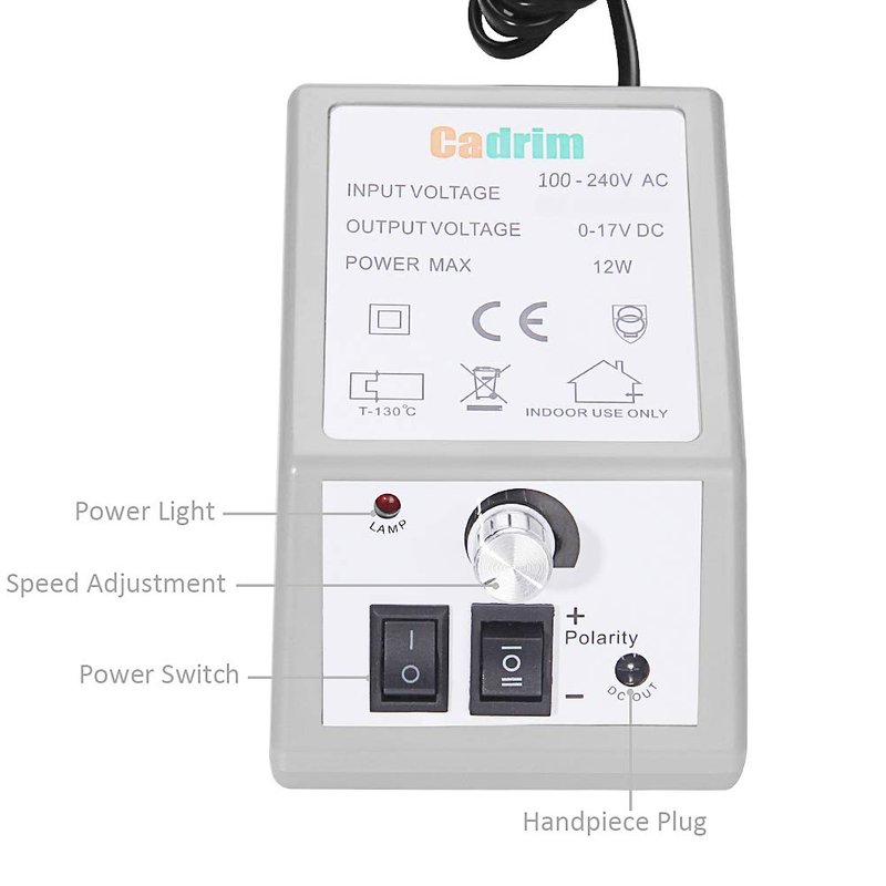 Discover the versatility of the Cadrim Electric Nail Drill, a high-quality metal machine designed for various applications including carving, engraving, routing, grinding, sharpening, sanding, and polishing. This nail drill is perfect for use with gel, acrylic, glass, natural nails, or silk wrap artificial nails, and features a speed adjustment function for your convenience. With a low noise and vibration design, it ensures comfortable grip and smooth operation for extended periods. The drill bits and sanding bands allow for immediate use, and the easy-to-use dialing speed control ensures consistent performance. This product is ideally suited for spas, beauty parlors, and personal use in homes. Remember to take breaks during continuous polishing to avoid overheating and ensure the machine's longevity. The product dimensions are 12.6 x 8.9 x 4.3 inches and it weighs 1.43 pounds.