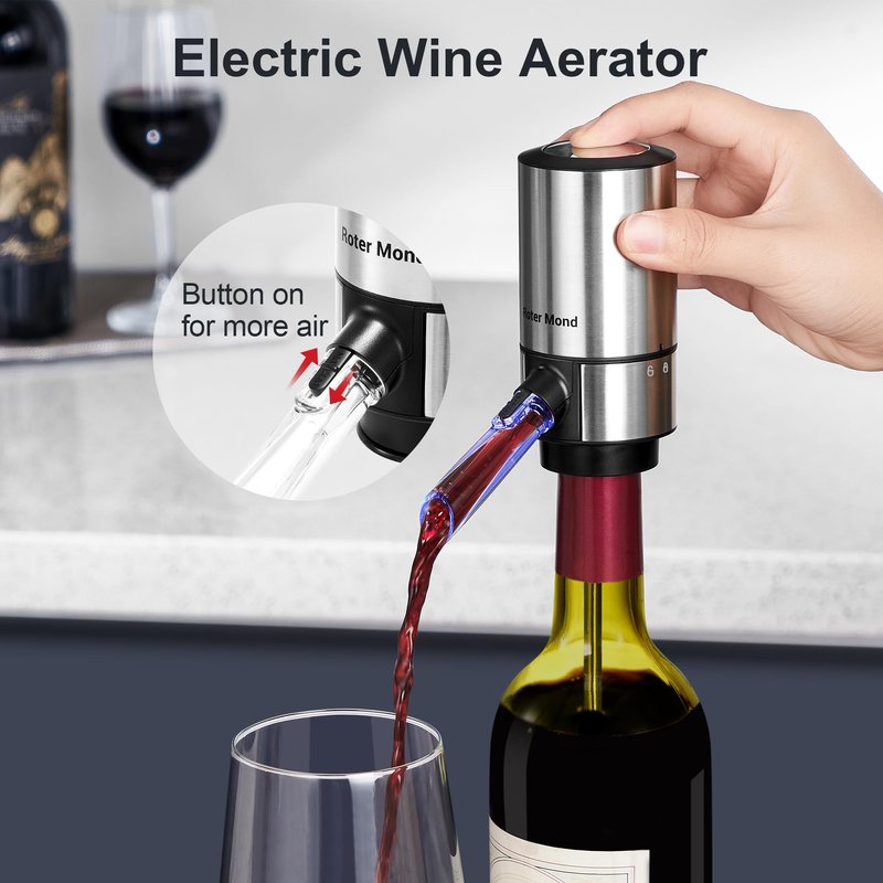 - Wine Accessories Included: The 5-in-1 wine set contains amost all you need, including wine opener, electric wine decanter with aerator, wine foil cutter ,2 push-to-vacuum stoppers with a date scale to record seal time.This wine kit will improve your wine tasting experience.