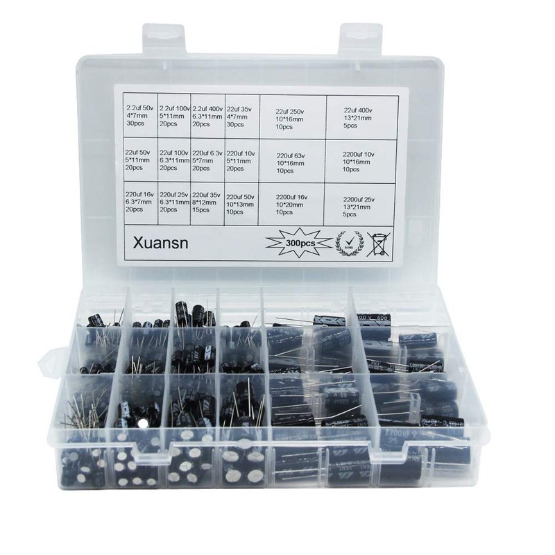 Electrolytic Capacitors 2.2uF 22uF 220uF 2200uF 6.3V 10V 16V 25V 50V 63V 100V 250V 400V Used in Toys Home Appliances Smart Meters Lighting Audio18Value 300Pcs XUANSN Capacitor Kit