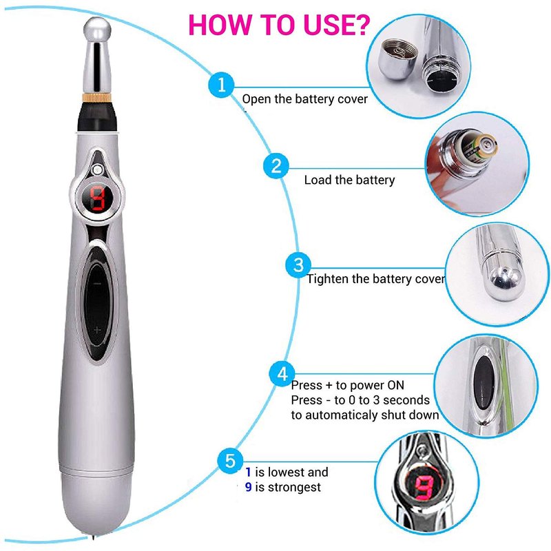 - 💝9 INTENSITY MODE : You can adjust to the proper level of energy based on different treatment need , when you feel a strong pulse by tipping the acupuncture pen around your body , that means you find the acupuncture points.
