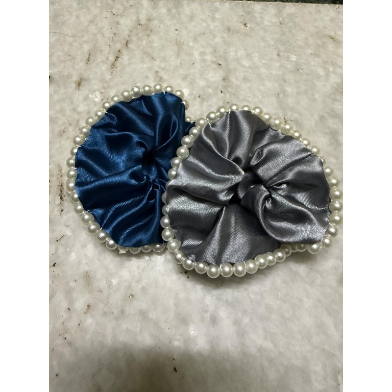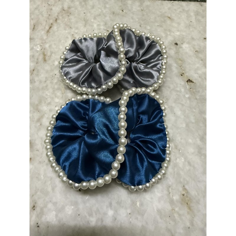 Elegant Satin Pearl Embedded Hair Scrunchies with Pearl Beads for Women – Pack of 2, Premium Satin Elastic Hair Bands for Stylish – Ideal for Weddings & Parties (Grey & Dark Blue)