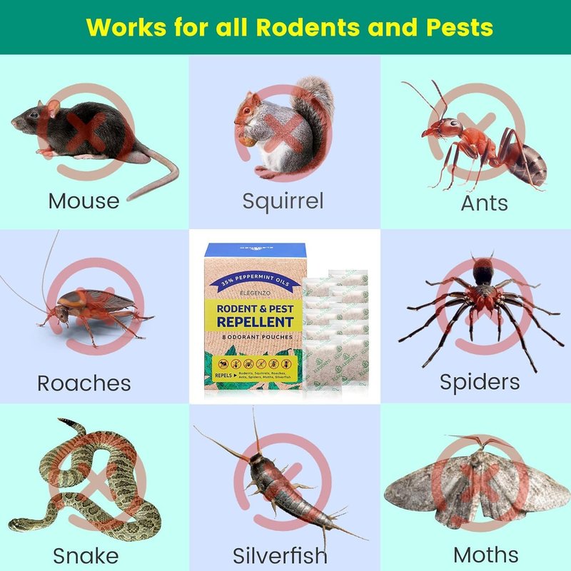 ELEGENZO Mouse Repellent Pouches with Peppermint Oil - Repels Mice, Rats, Squirrels, Roaches, Ants, Spiders, Moths