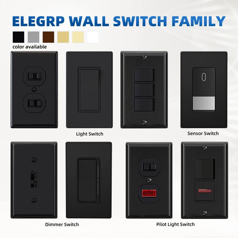 ELEGRP Matte Black Single Pole Decorator Light Switch, 15Amp 120/277V, Paddle Rocker Switch Wall Switch Replacement, Self-Grounding, Residential Grade, w/Wall Plate, UL/CUL (5 Pack)