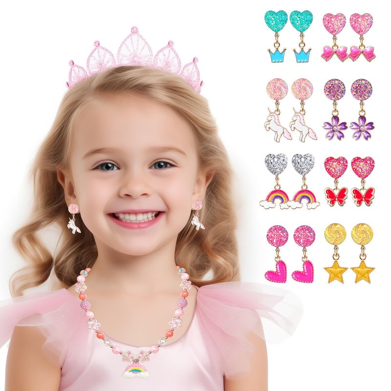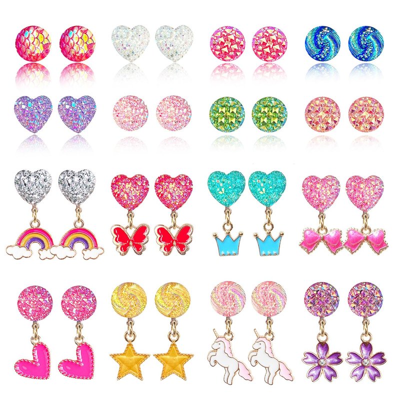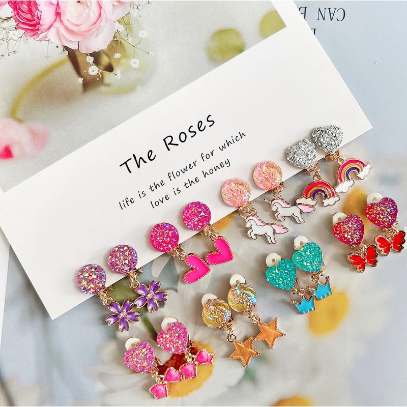 Adorable Design: Comes with 16 pairs different Child-Friendly Designs, Versatile styles and colors give you more options for different outfits. Clip-On Design: No Piercing Required, Fit for Children with Non-Pierced Ears. The soft rubber earring pad can well protect your ear from pain. Easy and Convenient to Wear: With the clip-on closure, the earrings can be easily put on and taken off, the package also come with some extra soft rubber earring pad. Material: Alloy, Nickel free. All the products have been tested and are safe for use. Great Gift Choice: All earrings are packed in the Pink Gift Box. These lovely princess clip-on earrings make the perfect gift for girls.Whether it's a birthday, theme party, festival, or any other fanciful occasion, these earrings will add a touch of magic to your little one's outfit. Box size: 7"*5"*1.3" It's a good gift choose for baby girls, toddlers, kids, teens.