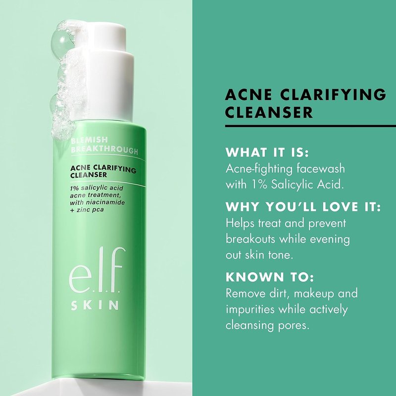 - PROMOTES HEALTHY SKIN: The e.l.f. SKIN Blemish Breakthrough Acne Clarifying Cleanser helps reduce current acne and promote healthy skin post-breakout.