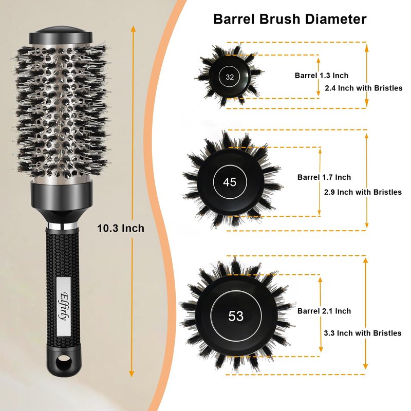 - 1.7 Inches Barrel Brush for Hair down to the Chest- The barrel has a diameter of 1.7 inches/45mm, and the brush has a diameter of 2.9 inches when including the boar bristles. This round brush is perfect for blow out, blow drying, creating medium waves, adding volume, etc.