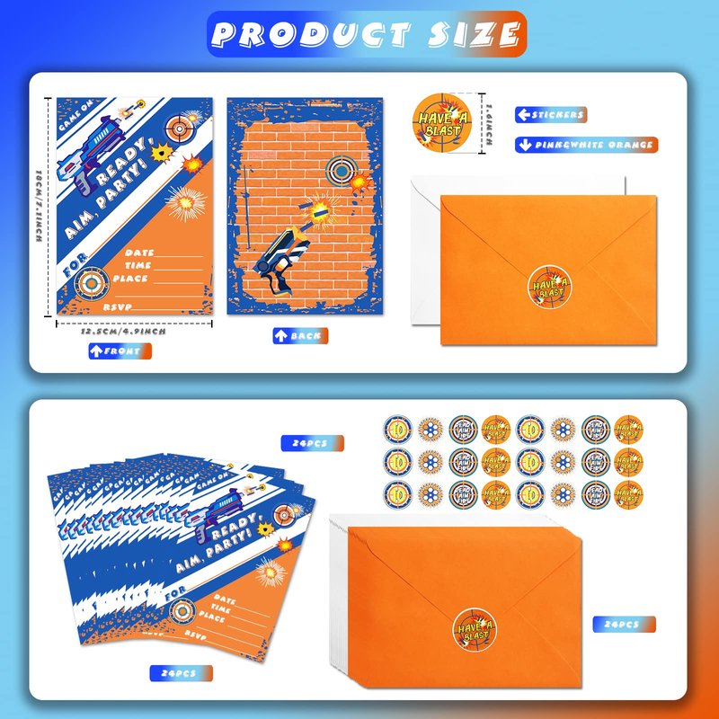 - WIDE APPLICATION:This invitation card set is perfect for dart war themed party. It’s the perfect choice for nerf gun party.