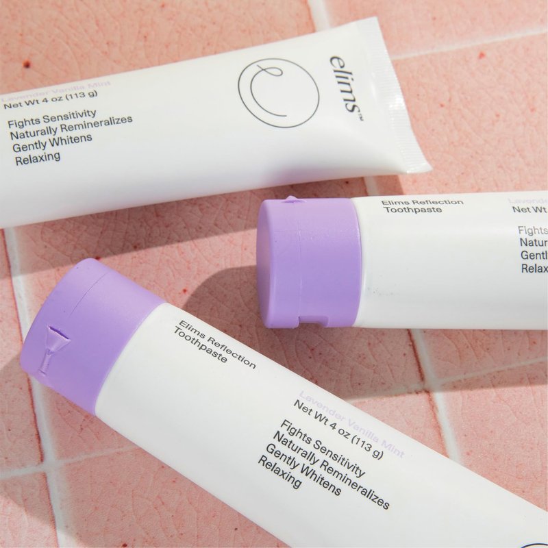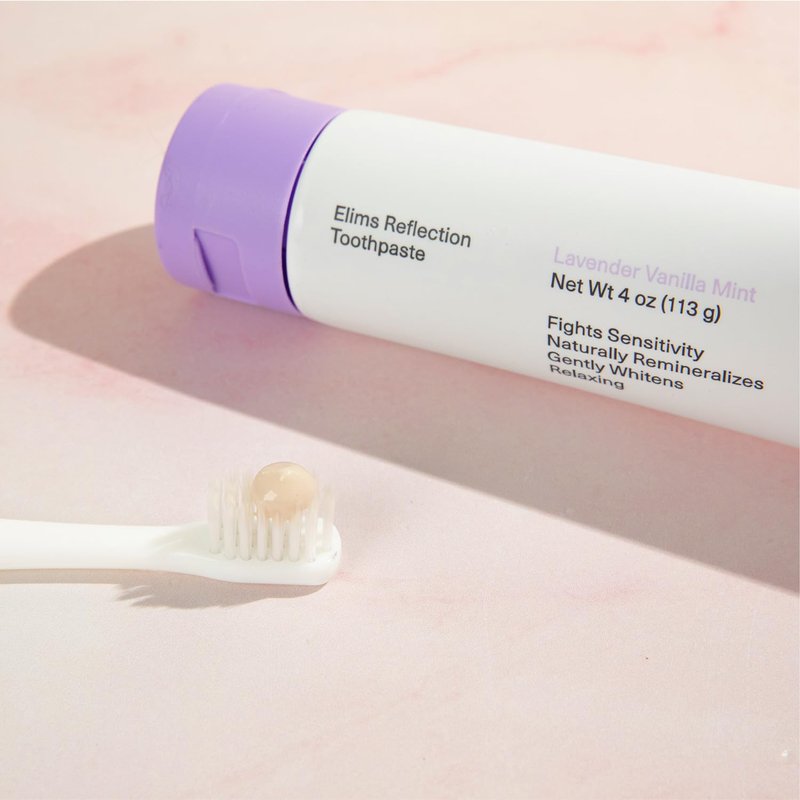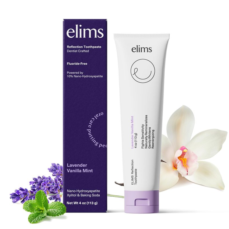 THE BETTER FOR YOU WAY TO GET A GLEAMING GRIN Finally, a toothpaste that’s every mouth’s dream come true. Combining the best of science and nature, Elims Reflection toothpaste is thoughtfully crafted by dentists and contains the mineral NANO-HYDROXYAPATITE, a clinically-proven natural fluoride alternative that helps rebuild the foundation of your teeth and XYLITOL, a plant-based sugar alcohol to keep your mouth nice and clean. Delicious and effective, our original formula paste is uniquely flavored with a mix of soothing chamomile, creamy vanilla, relaxing lavender essential oil, and plaque-busting coconut oil all in a sustainable tube made from renewable sugarcane.
