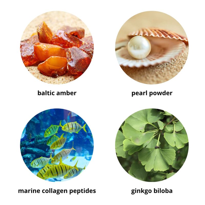- contains extracts of Baltic Amber, Marine & Silk Peptides, Hyaluronic Acid and other effective skin nutrients.