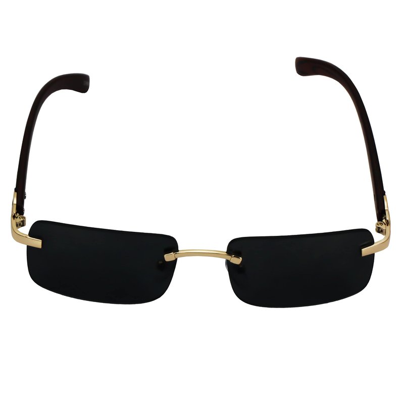 Elite Slim Rimless Rectangular Metal & Wood Art Aviator Sunglasses (Black)