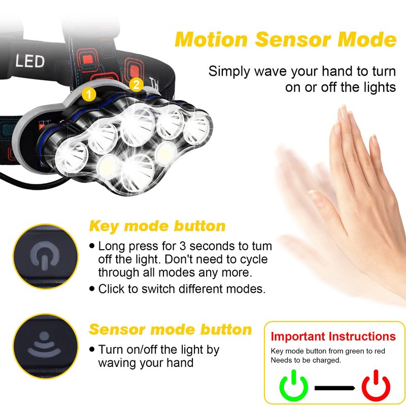 - 2. π β Long Press Function and Motion Sensor Design: Unlike the old version headlamps, Elmchee the new head lamp has added a long press function, in any mode, if you hold the key mode button for 3 seconds, you can turn off the light directly, no longer need to cycle all modes.In addition,it also added motion sensor function mode, you can easily turn the lights ON/OFF by waving your hand, which is more convenient and avoids soiling the headlamp when you hand is dirty or the environment is harsh.