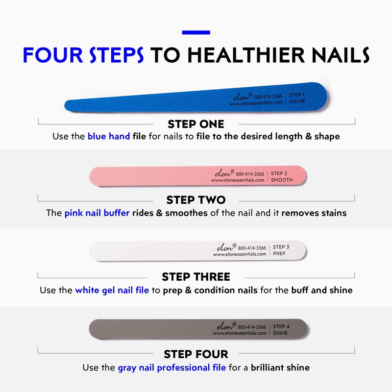 - 4 STEPS TO A HEALTHIER NAILS: Our nail care kit is a 4 step filing process to rebuild and restore the original health and beauty of nails. This nail file set is fully padded for comfort can also be sterilized so you can use in the salons. Try it with the Elon nail conditioner for healthier nails tomorrow!