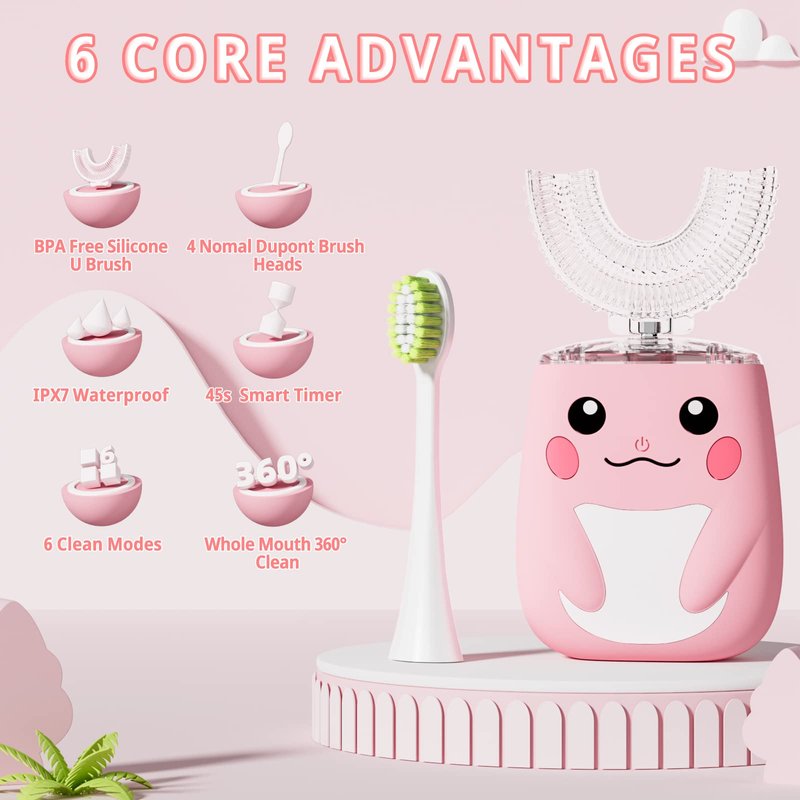 - More Brush Heads: The u-shaped toothbrush with 4 replaceable normal brush heads and 2 u-shaped brush heads, this electric toothbrush can clean every angle of kid teeth and gums, mouth clean.