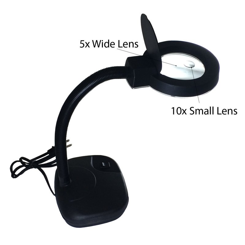 ELUCIDATE 2-in-1 5x Black Magnifier & Table Lamp (MG-99550), your versatile companion in crafting, reading, and executing precise tasks. Standing on a sturdy base with a sleek black finish, this essential tool embodies functionality and style.Constructed with a powerful 3½" (8.9 cm) diameter magnifier that hosts a 3 diopter/8 diopter lens, this innovative lamp ensures a distortion-free magnification, elevating your focus to the smallest details. Lift the flip-top cover to reveal the magnifier or keep it closed for a regular fluorescent desk lamp, illuminating your workspace with an 11W (11W) fluorescent light bulb. Its adaptable 12" (30.5 cm) flexible gooseneck directs a cool, steady stream of light exactly where needed, fostering optimal visibility at all angles.Operated with an easily accessible on/off switch located on the base, and powered by a 110V (110V) regular household current, the lamp is designed for seamless integration into your home or office environment. Adding to its array of features is a replaceable round fluorescent bulb, which guarantees longevity and consistent lighting.Whether you're a hobbyist needing a detailed view of intricate pieces, a student burning the midnight oil, or a professional aiming for precision in your craft, this lamp caters to a wide spectrum of users. The sleek design ensures it occupies minimal space on your table or countertop, making it a must-have for small and large workspaces alike.