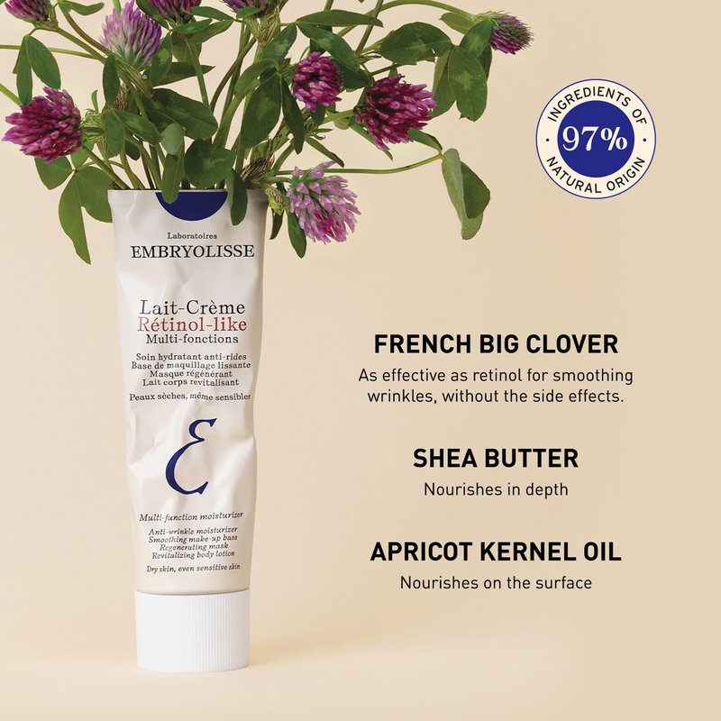 Discover the versatility of EMBRYOLISSE Lait Creme Retinol-Like, a French skincare essential for sensitive skin. This innovative formula provides the firming benefits of retinol without the harsh effects, thanks to its plant-based active ingredients. A multitasker at heart, it serves as a daily moisturizer, makeup primer, and firming moisture mask. This retinol-like repair cream boasts a rich formula that deeply hydrates and nourishes the skin, leaving it feeling soft and rejuvenated. Renowned for its use in professional makeup artistry, Embryolisse Lait-Crème provides a perfect canvas for makeup, enhancing durability and finish. The face and body cream’s emollient properties, featuring key ingredients like apricot kernel oil, glycerin, and shea butter, ensure long-lasting hydration, as well as anti-aging repair and protection. Ethically formulated, Embryolisse does not test on animals, making it a cruelty-free choice for conscious consumers. Whether you have dry or sensitive skin, this sophisticated and versatile French face cream will streamline your skincare routine, offering multiple benefits in one tube. Recommended by pharmacists and used by professional make-up artists, experts swear by the multi-functional Embryolisse moisturizer to care for fragile skin and keep it beautiful.
