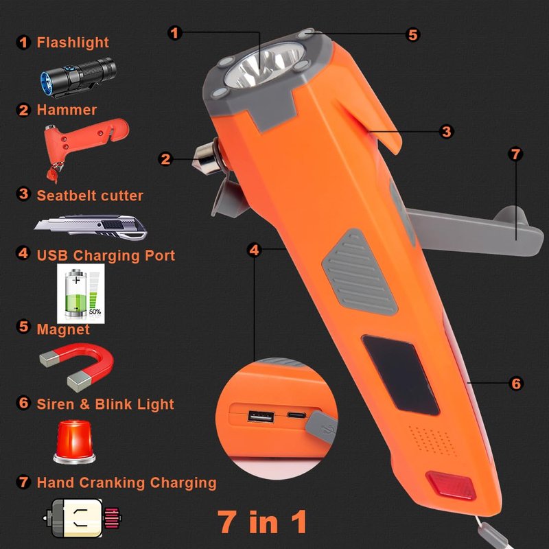 - ◈7 in 1 EMERGENCY KIT: We wouldn't predict when an accident will be happen,So we need multifuctional safety hammer to keep ourselves and our lover safe in an emergency situation.The multifunctional emergency tool with Car safety hammer, Seat belt cutter,Red siren &blink light(SOS alarm),Magnet, LED flashlight,USB charger with cables,Hand cranking charging system.
