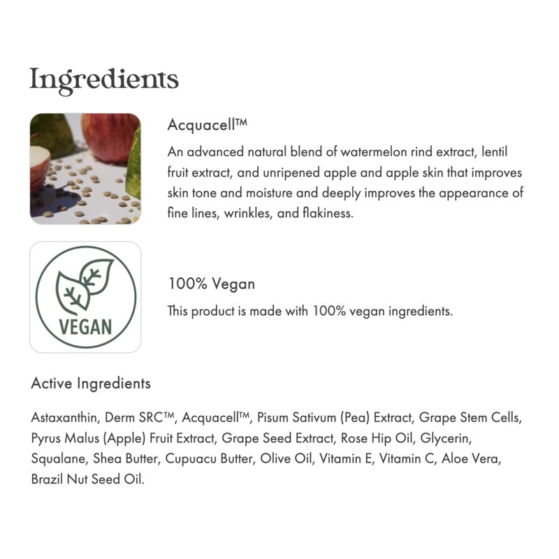 An active, nourishing cream with super-antioxidant astaxanthin, Derm SRC with bamboo and pea extracts, Acquacell with watermelon rind and lentil extracts, grape stem cells, apple extract, rose hip, olive oil, shea butter and more, designed to fight the appearance of fine lines, wrinkles, puffiness and under-eye circles, while hydrating for a radiant glow.