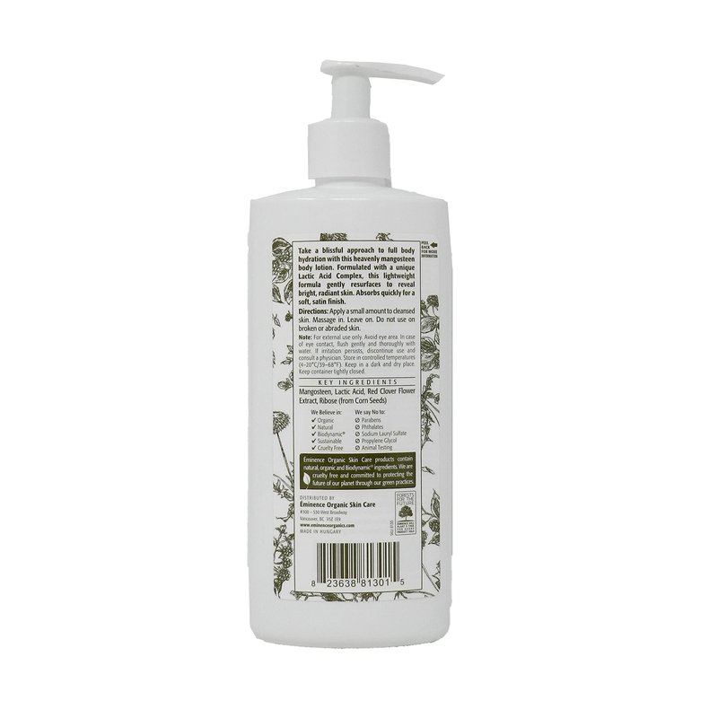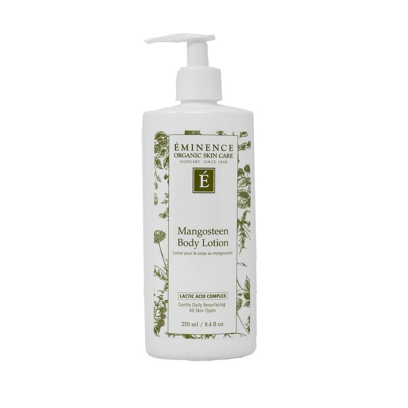 - Invigorate your skin with Mangosteen Body Lotion from Eminence Organic Skin Care. Formulated to reverse the effects of dry skin and maintain natural moisture levels, this body lotion is powered by lactic acid and mangosteen to gently resurface the skin and boost a more naturally luminous finish on the skin.