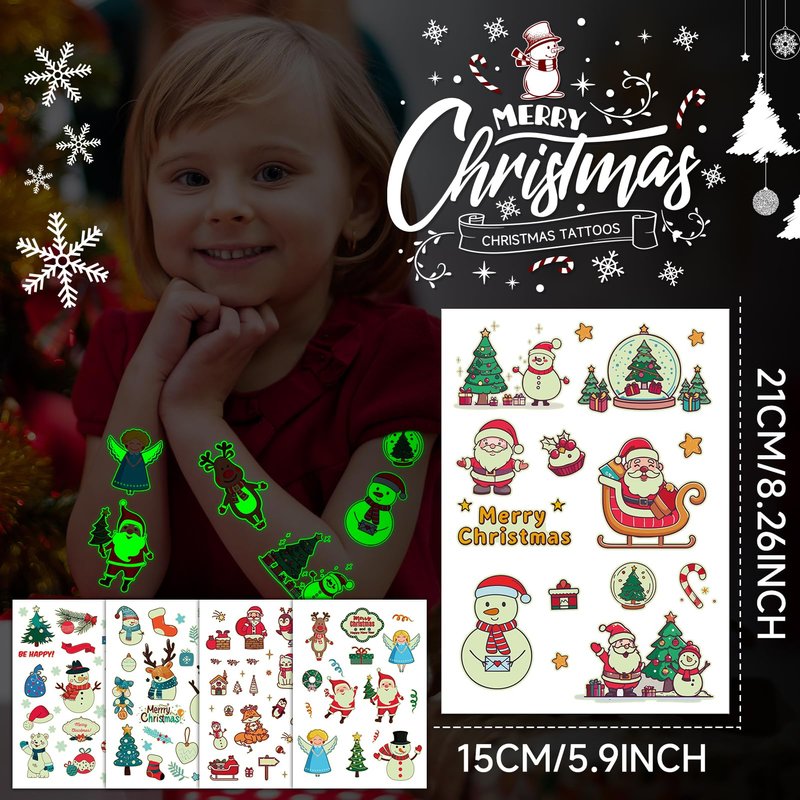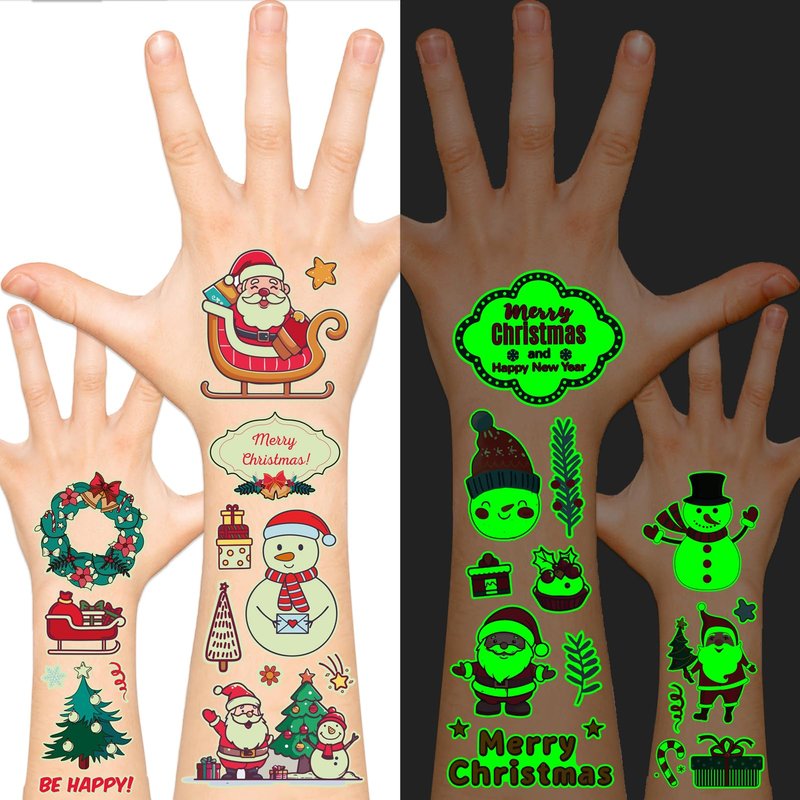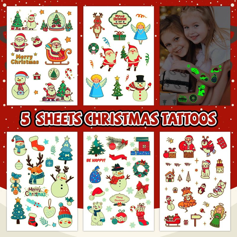 - 【Christmas Tattoos for Kids】You will get 5 sheets (about 120 styles) of luminous temporary tattoos for kids, there's a lot to choose from, including Santa Claus, Socks, Snowmen, Snowflakes, Christmas tree, Reindeer, and other Christmas elements that kids will like! And your little ones can trade tattoos with each other at the Christmas party, which can be a fun memory for them to look back on.