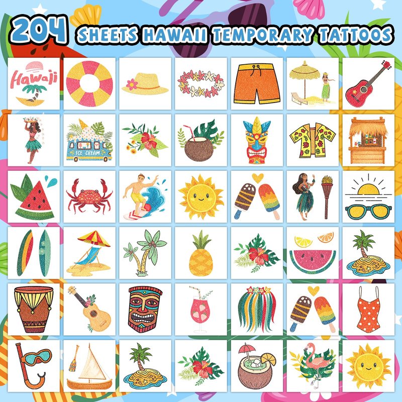 - 【Multiple Patterns With Cool Luau Design】This kind of kids tattoo has rich beach elements like surfboards, beach chairs, swimming rings, coconut groves, bikinis, ice cream, flip flops, and more. It will be great fun for kids to play at the pool and beach.