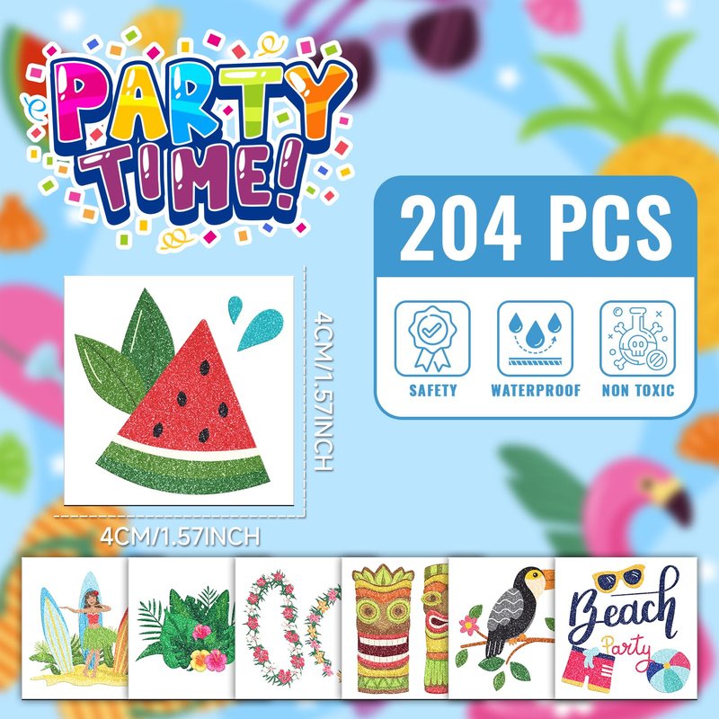 EMOME 204 Sheets Kids Tattoos Luau Beach Party Decorations, Individually Wrapped Glitter Tattoos for Kids Pool Party Favors Supplies, Hawaiian Beach Themed Decor Goody Bag Stuffers for Kids