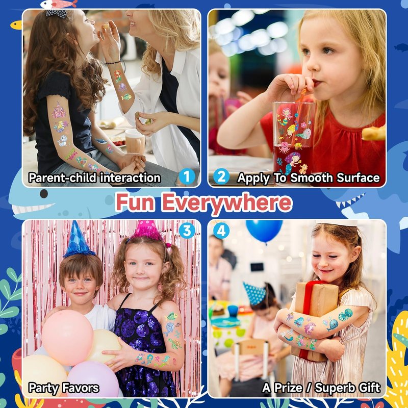 • 【Glitter Ocean Themed Mermaids Temporary Tattoos】These sea creature tattoo stickers are made of pink glitter. Manufactured using a special process that allows it to glitter in the sunlight. Great birthday party toy for kids, also can be shared to your own family and friends. They can add more fun to girls' birthday party games and activities!