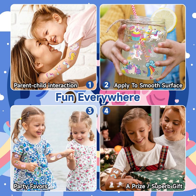 - 【Party Accessory for Kids】Great for birthday parties, baby showers, goodie bags, classroom rewards, etc. It also applies to some smooth objects, for example, glass, stationery, paper, crafts cups, cabinets, and bottles. These tattoo stickers are good for a party! Popular hit with the girls.