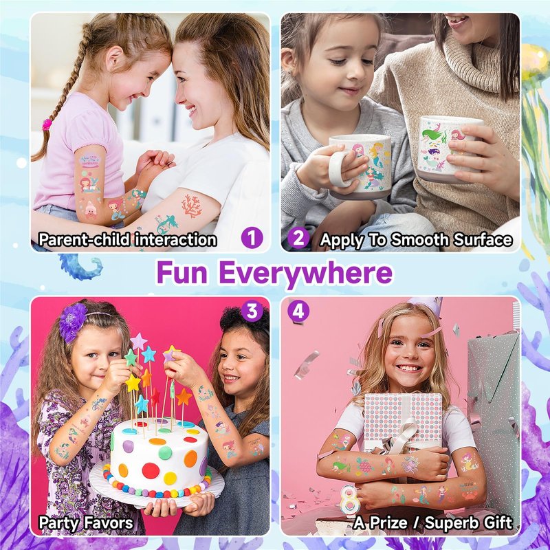 - 【Easy To Apply And Remove】Applying these mermaid tattoos is easy. Simply choose your desired design, place it on clean, dry skin, and press a damp cloth or sponge against the tattoo. Wait several seconds, and then you will get a cute temporary tattoo. If you want to change or remove it, use olive oil, baby oil, or alcohol.