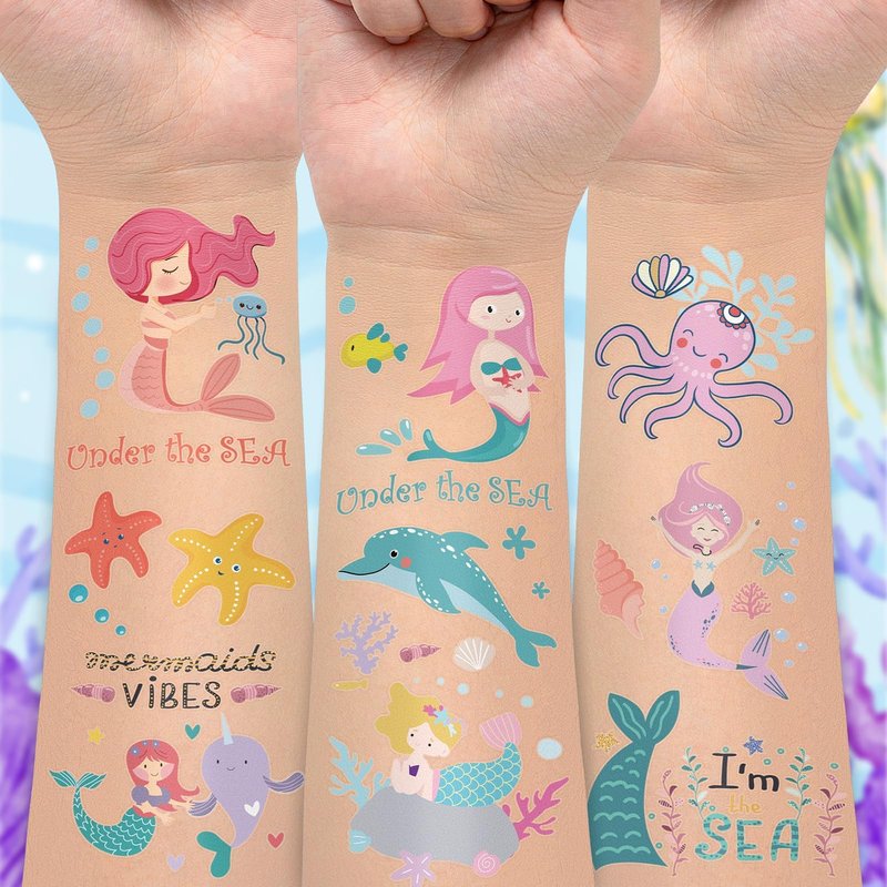 - 【Individually Wrapped Sheets No Need to Cut】50 sheets ocean-theme tattoos individually wrapped to be easily included in a party gooide bag or kids stocking stuffers. It's very convenient for kids even if you are at mass people's parties, you can have a different tattoo from others. These pretty and attractive tattoos will keep you and your little ones, and their friends more beautiful. Great for mermaid birthday decorations, and ocean animals parties.