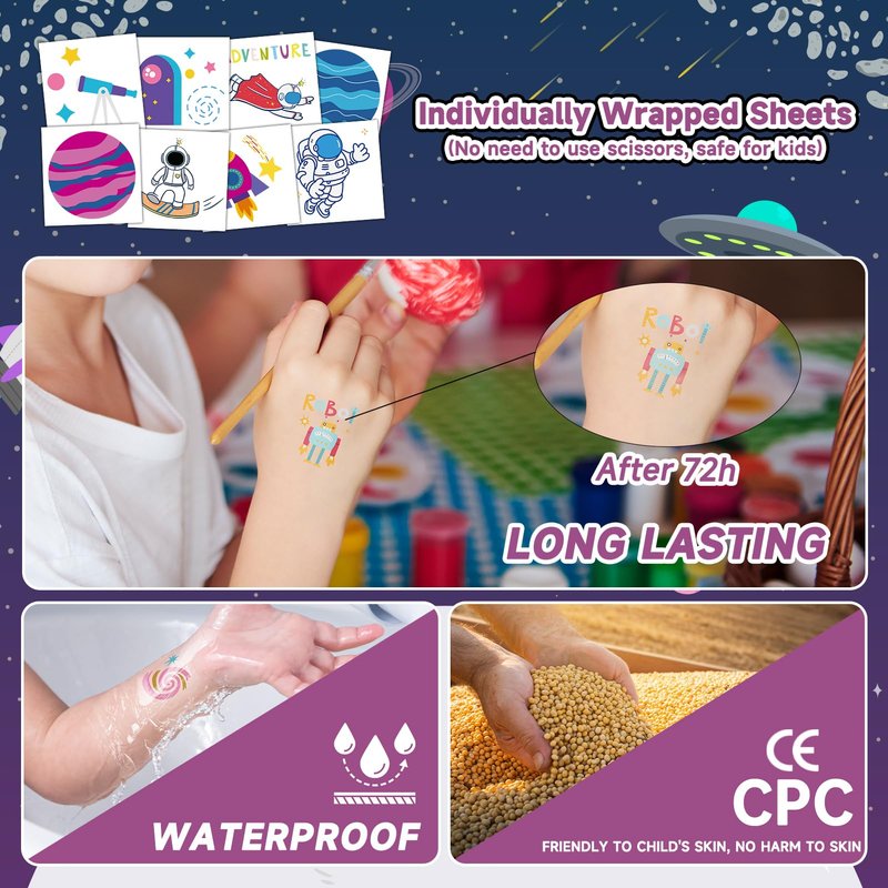 - 【Waterproof and Long Last】These outer space tattoos with the latest waterproof technology and eco-friendly inks, are safe for children's skin. You can paste waterproof tattoos on your body to show your personality and can be used in wet places.