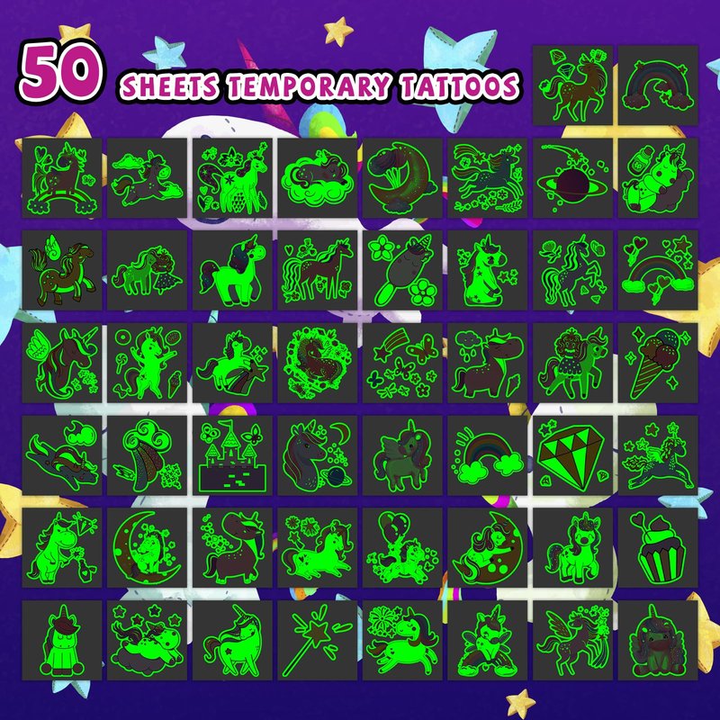 - 【Temporary Tattoos for Girls】The package includes a delightful collection of 50 individual temporary tattoos, ensuring that every child at the celebration can receive an adorable tattoo. These luminous designs are sure to add a touch of magic and enchantment to any event, making them the perfect choice for a memorable and fun-filled gathering. A Sparkling Addition to Your Party!